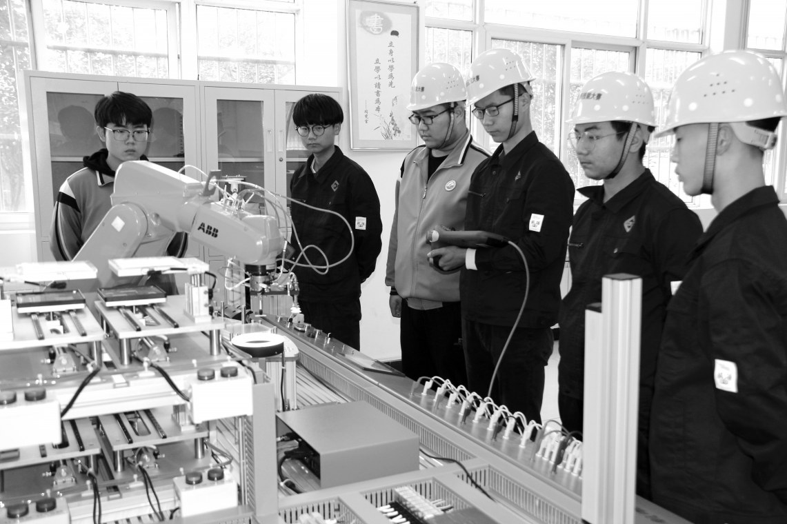 ▲咸阳市武功县职教中心学生正在练习操作工业机器人