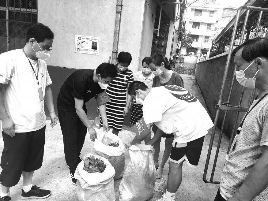 图为志愿者为社区群众分发蔬菜