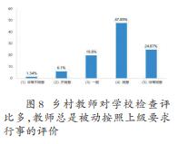 基层在乡村学校布局规划、乡村教师队伍建设统筹谋划、管理等方面的能力不足,对乡村教师队伍建设的重要性认识不够,缺少系统、全面、科学、有效的治理。调研中,72.0%的乡村中小学教师认为,学校检查评比多,严重影响学校正常教育教学。