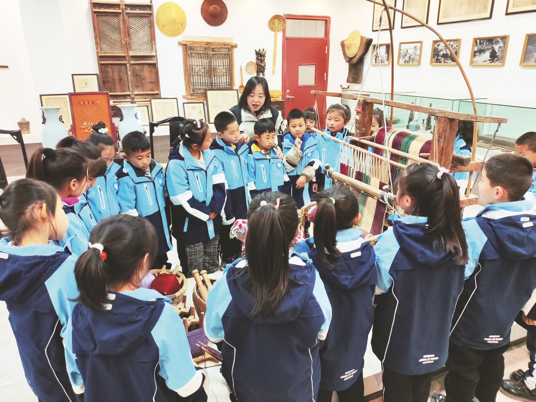 有了系统化的课程体系做指导,农耕文化博物馆也得以“动”起来、“活”起来、“用”起来。四十五小学把博物馆的资源开发、作用发挥等纳入“朴·源”劳动课程体系建设中,把博物馆陈列的农耕工具用图文并茂的方式在校内劳动教育读本中进行呈现,作为各年级劳动课程的重要内容。教师根据教学需要,可以带学生到展馆内进行现场教学,也可以把部分工具拿到教室进行教学。“我带学生到博物馆上课的目的是希望通过‘摸一摸’‘猜一猜’等方式让孩子们了解农耕用品的名称、材质和功能,让他们体会劳动人民的智慧。”担任一年级劳动选修课程教学的田颖说,“下节课我将会带学生走进劳动实践基地,让他们亲自体会劳动生产。”