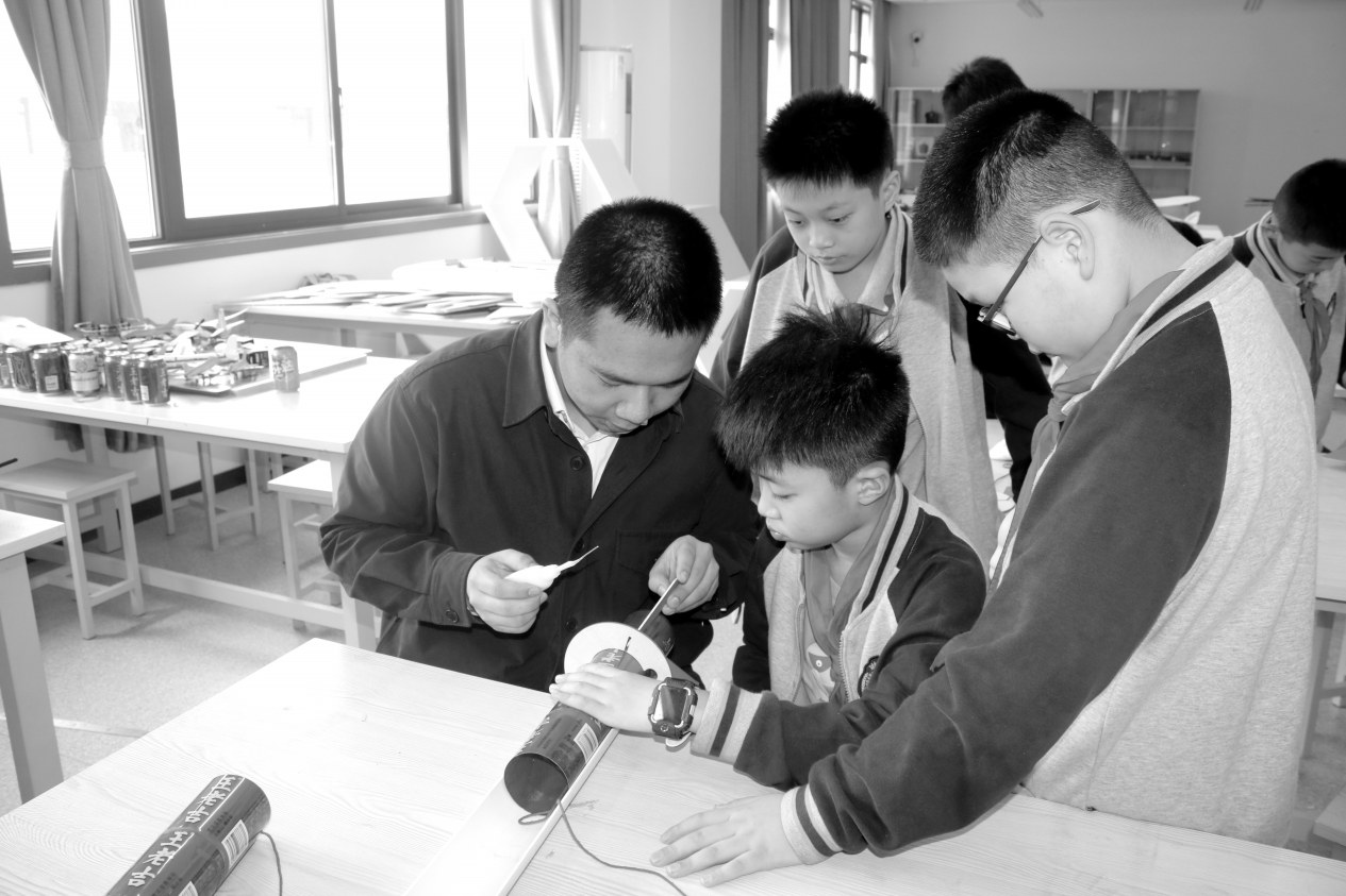因为航模在生活中离这群孩子还很远,仅是口头描述,他们难免没有概念,因此,为了让他们脑海中有具体的印象,我常常会拍摄一些视频或在班级展示航模,以此激励他们“动”起来。制作火箭模型的过程中,常常需要用到美工刀、热熔胶等较为危险的物品,所以面对班级这些二年级动手能力还相对薄弱的孩子,每当需要用到这些工具时我便手把手进行辅助。