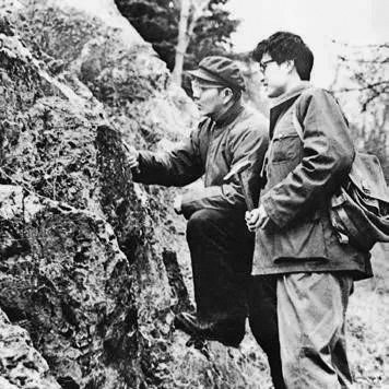 1983年左右,顾知微(左)与学生在南京观察侏罗纪砂岩