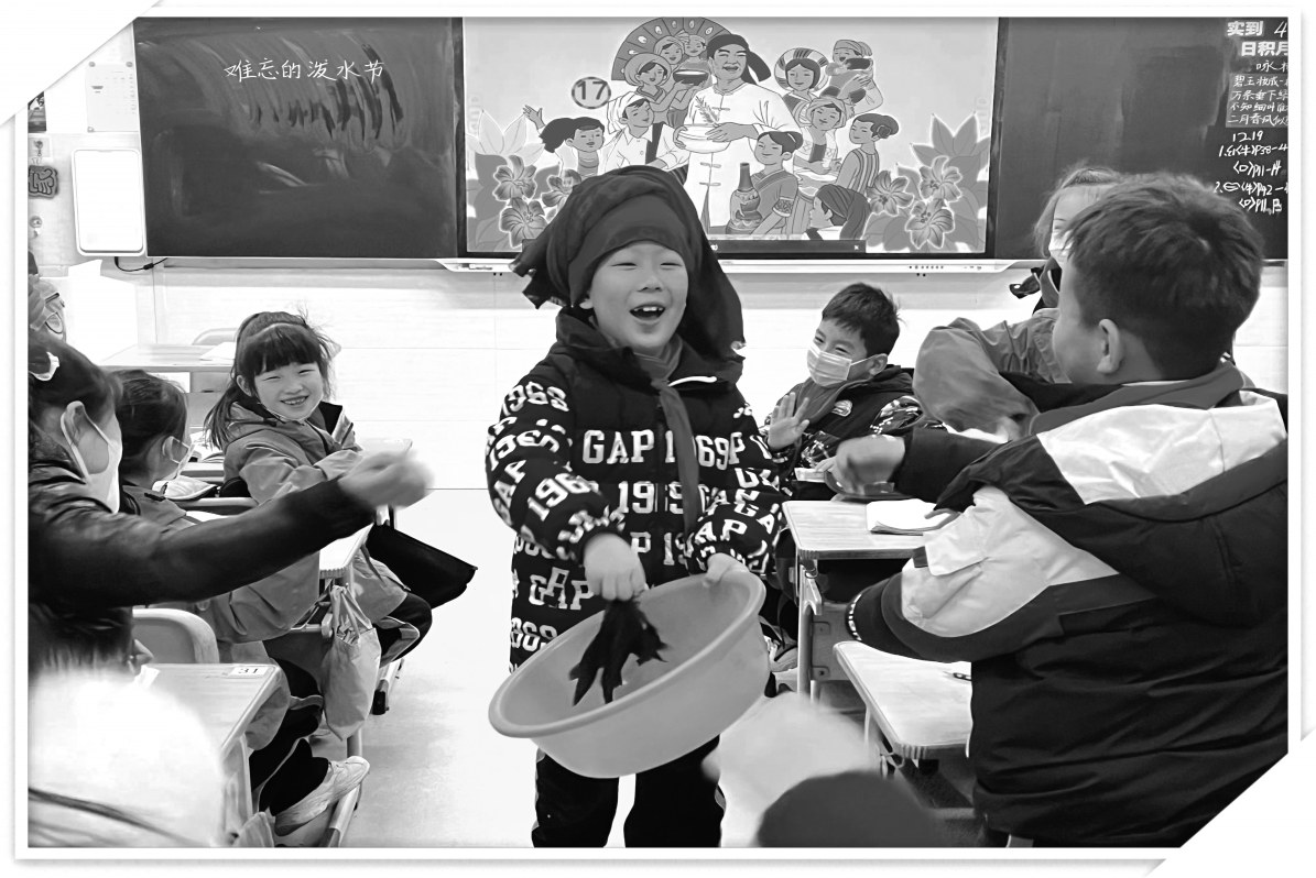 我低头一看,确实,我的红色围巾不就是道具吗?我心想孩子们是爱表演的,前一段时间教学节我们班有学生去演《葡萄沟》中热情好客的维吾尔族老乡,还有同学去演了老师创设情境的日月潭导游——小阿里,对了,“显眼包”还演了从古代穿越来介绍庐山瀑布的古人呢!想到这些,我决定说演就演,我组织孩子们先自由朗读“剧本”,没有银碗孩子们想到了班里的水盆,没有柏树枝孩子们拿出了鸡毛毽子上的鸡毛充当。道具准备好了,谁来演呢?第一个举手的是我们班的领读员,我给他围好了红色的头巾,只见他左手端起水盆,右手拿着鸡毛,有模有样地装着蘸了水,向人们泼洒。下面的“群众”也兴奋了起来,有模有样地回应着:“祝您长寿!”“周总理,我们在这里!”领读员演完后,意犹未尽,我随机化成了记者,采访了他:“请问周总理,您觉得傣族人民如何呀?”“周总理”回答道:“大家太热情了,太热情了。”这时“显眼包”举手说:“老师,我觉得他演得不够好。”“哦?哪里不好?”我问。“他不是面带微笑,而是笑得太夸张了,还有咱们都没有跳起来。”孩子们齐声说:“那你演!”“显眼包”一直是机会的创造者,没等我叫他,已经从领读员的手里拿起来围巾缠绕到了自己的头上,他还跳起旋转的舞蹈,一只手用“柏树枝”给“人民群众”洒水,说道:“祝你们幸福!祝小朋友们天天开心!祝老爷爷老奶奶身体健康……”我一直站在旁边观察着,看着孩子们沉浸在这热闹又充满互动的场景中,我想这就是盛况啊,这不就是现场感受着“周总理”的平易近人与傣族人民亲如一家的情感吗?这不就是泼水节隆重而热烈的气氛吗?