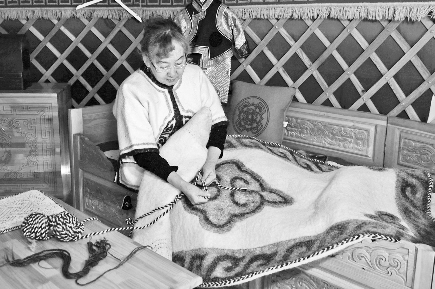 “研究、选料、刺绣、擀制……制成一件像样的传统厄鲁特蒙古袍可不是一日之功。”斯仁吉木手里,正在制作一件冬款的羊毛薄毡坎肩,毛毡一直是北方游牧民族的生活必需品,洁白的毡子是富裕与美好的象征。在斯仁吉木的蒙古包里,从包顶到围毡、地毡,从家居摆件到随身用品,草原人民的生活中毡绣无处不在,纯粹的用色、抽象的民族图案,传达了蒙古族人民独特的审美和对美好生活的期许,有别于中原刺绣的精巧秀美,斯仁吉木手中的蒙古毡绣尽显粗犷壮美,无论是载体,还是刺绣风格,都具有强烈的游牧民族特色,可谓刺绣世界的奇葩。
