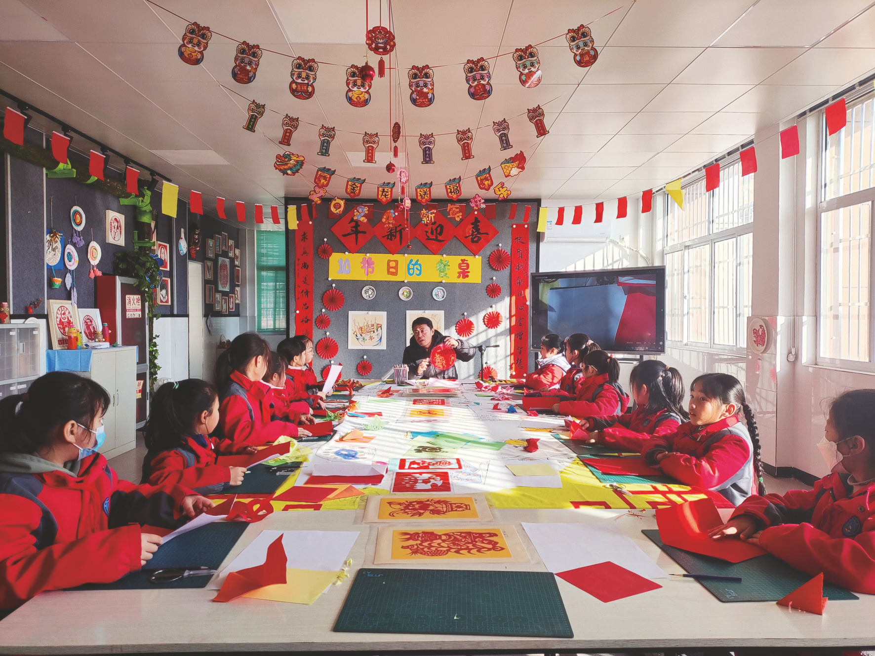 兴平市秦岭小学剪纸社团的学生们在学着剪窗花
