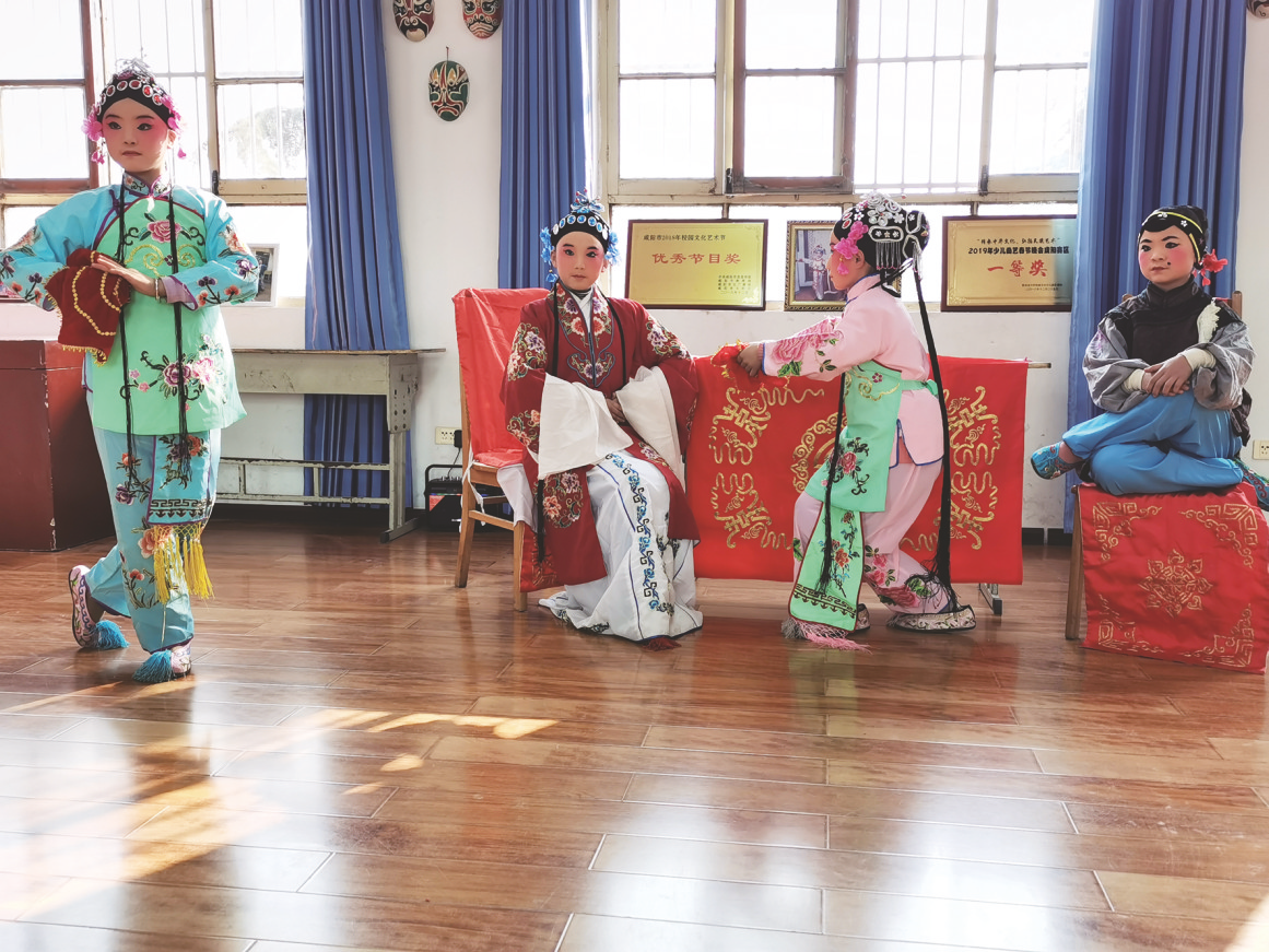 兴平市逸夫小学戏剧戏曲社团的学生在表演剧目《看女》