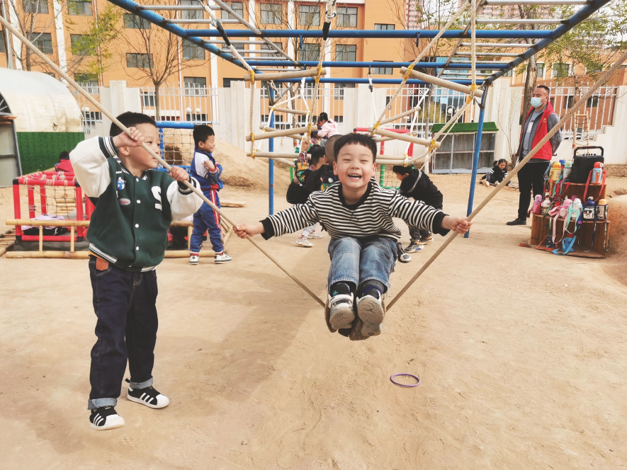 定边县第五幼儿园的孩子们在玩荡绳