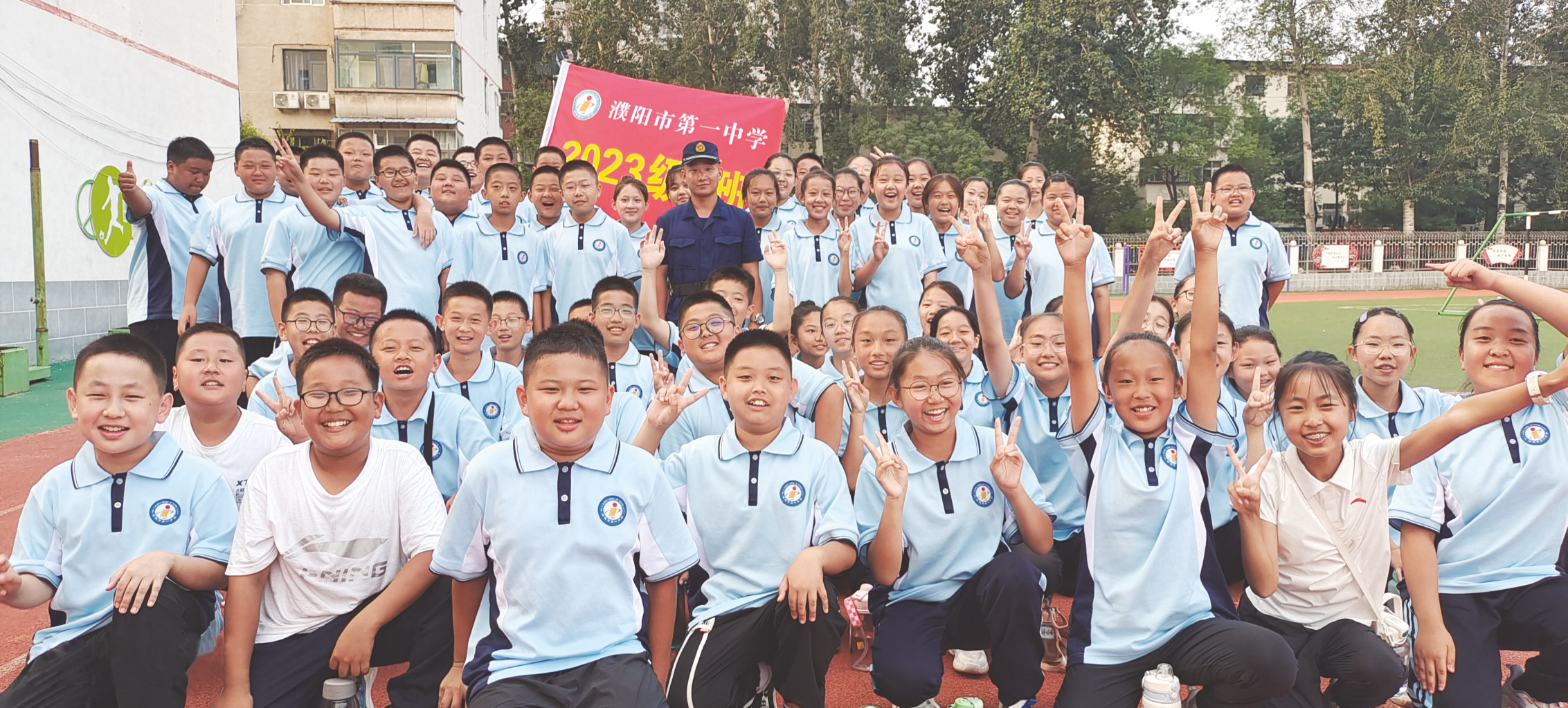 我刚刚送走一届成功的学生,他们展翅高飞,在理想的学府继续深造;我又迎来了崭新的2023级新生,趁着盛夏烈日、暴风骤雨,我们开启了军训生活,相互支持、彼此成就:听!“五班五班,一马当先;青春飞扬,勇夺桂冠”震耳欲聋的口号响彻寰宇,刹那间人到中年的我仿佛重回青春,精神抖擞冲锋在队伍前列,追随着教官铿锵有力的口令,新的班集体从此一往无前!眼前这一班风华少年又将开启中学新征程,他们清纯的模样、矫健的身姿、嘹亮的口号、冲天的豪情都会成为2023级青春的注脚——苦涩却甜蜜,短暂而恒久!