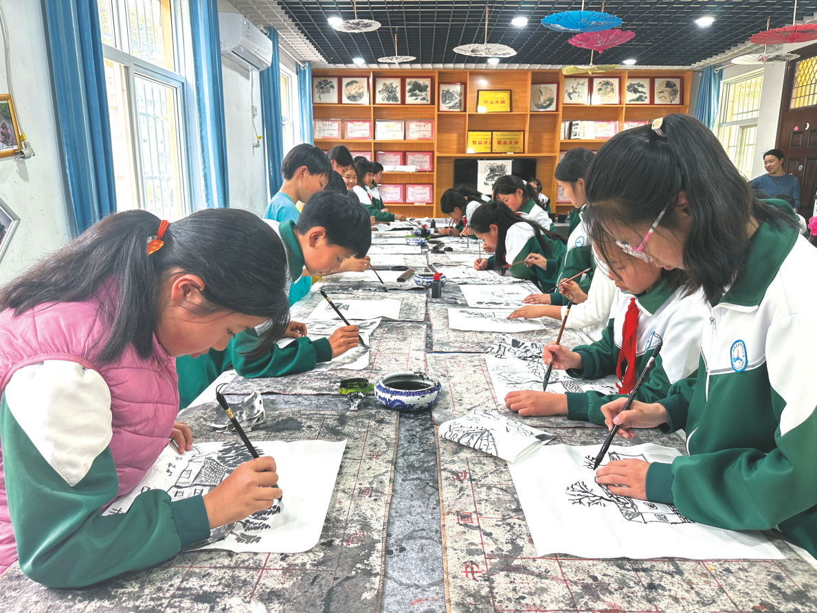 目前,水墨画已成为双龙镇的一张特色名片,此项工作已实现义务教育阶段的全覆盖,学生群体也由留守儿童扩充至全镇所有学生。学校利用周末、寒暑假带领学生走进村落,把美育课堂“建”在山间水畔、农家小院,让孩子们品味乡土文化、体验非遗传承、探寻红色根脉。“孩子们通过水墨画的学习与创作,不仅审美能力提升了,对传统文化也有了更深刻的认识与理解,培养了他们的民族自豪感和文化自信。”侯启康说。