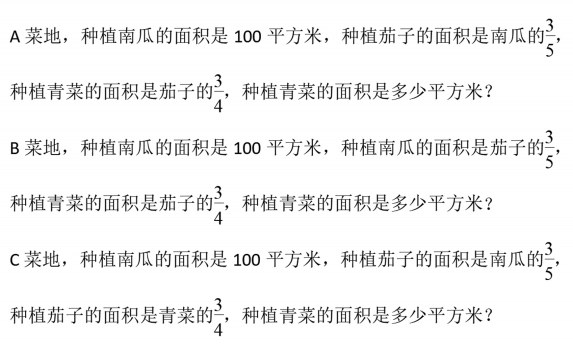 此类习题使学生能在更大的背景中基于分数乘法的意义分析数量关系,避免学生依靠题目中的某些词语盲目选择算法,而是通过整体分析题意找出数量关系,明确本质,解决问题。