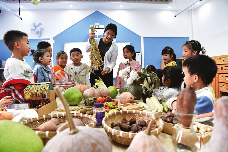 10月15日,浙江省建德市寿昌新城幼儿园开展“世界粮食日”主题教育活动,教师以20余种秋收果实作为教具,让孩子们通过辨识粮食作物,知晓粮食知识,并引导他们从小养成珍惜粮食的好习惯。