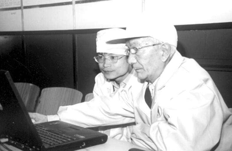 2003年2月12日,王希季(右)在探测一号卫星震动试验现场