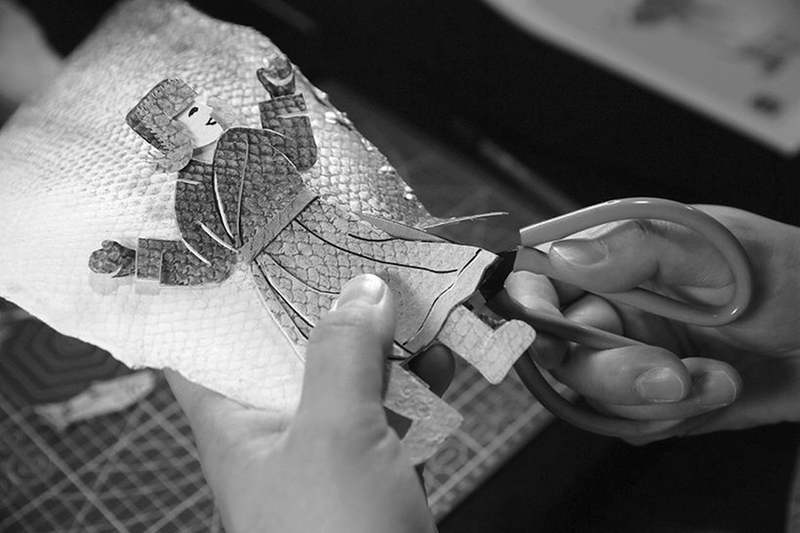 在孙大立眼中,鱼不仅是餐桌上的佳肴,更是艺术创作的灵感源泉。他拿出几块加工好的鱼皮,准备制作“赫哲族人渔猎生活”系列鱼皮画。制作鱼皮画,首先要对鱼皮进行加工处理,经过精心剥取、晾晒、熟制、软化等多道工序处理后,鱼皮变得柔软而富有弹性,适宜雕刻和着色。鱼皮画的制作工艺有粘贴和镂刻等。“传统的镂刻工艺是在鱼皮的背面,用刀或剪刀进行裁剪,镂刻也可以与粘贴工艺相结合。”孙大立说。只见他几笔就在鱼皮的背面画出了一个猎人形象,随后便拿起剪刀按照轮廓麻利地剪制。“裁剪这步最为关键。”孙大立边剪边说。鱼皮不同于其他材料,需要巧妙地利用其天然纹理与色泽,或是以鱼鳞为点缀,或是以鱼鳍为轮廓,每一步都要恰到好处,才能让画面生动自然,既展现手绘的精妙,又保留了鱼皮原有的生命力。他熟练地粘贴组合,不消片刻,一幅鱼皮画就呈现在眼前。