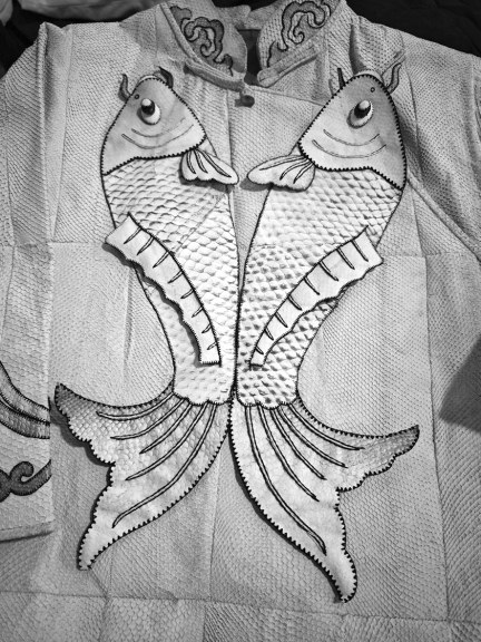 天然的鱼皮花纹多样,浑然天成,充满自然之美。鱼皮画的色彩虽然不如油画那般绚烂,却有一种难以言喻的沉稳与内敛,如同赫哲族人的性格,坚韧而不失温柔,深沉而不失热情。一幅幅画作充满了浓郁的生活气息,巧妙地利用了鱼皮的天然纹理和色泽,观之仿佛能够穿越时空,感受到那份遥远的呼唤。孙大立是位真诚热情的东北小伙儿,与他那魁梧的身材形成鲜明对比的,是他身上浪漫真诚的艺术气息,他总是认真耐心地向访客们讲解鱼皮画的历史、工艺以及制作过程。鱼皮文化是存在于北纬45度以北的高寒地区的特色文化,鱼皮制品以生活在三江流域的鳇鱼、大马哈鱼等冷水鱼的鱼皮为原料,这些鱼的皮具有一定的厚度和韧性,比较耐磨,便于在生产生活中使用。在三江流域,有16个民族使用鱼皮制品,赫哲族是其中使用时间最长、鱼皮制作技艺最为精湛的民族。赫哲族人以渔猎为生,他们捕鱼、食鱼,用鱼皮盖房、造船、制衣,在历史上有“鱼皮部落”的别称。