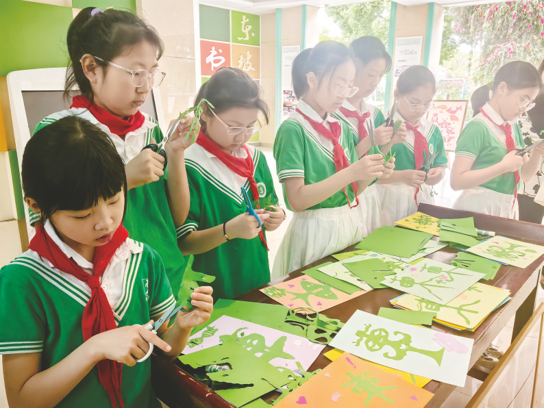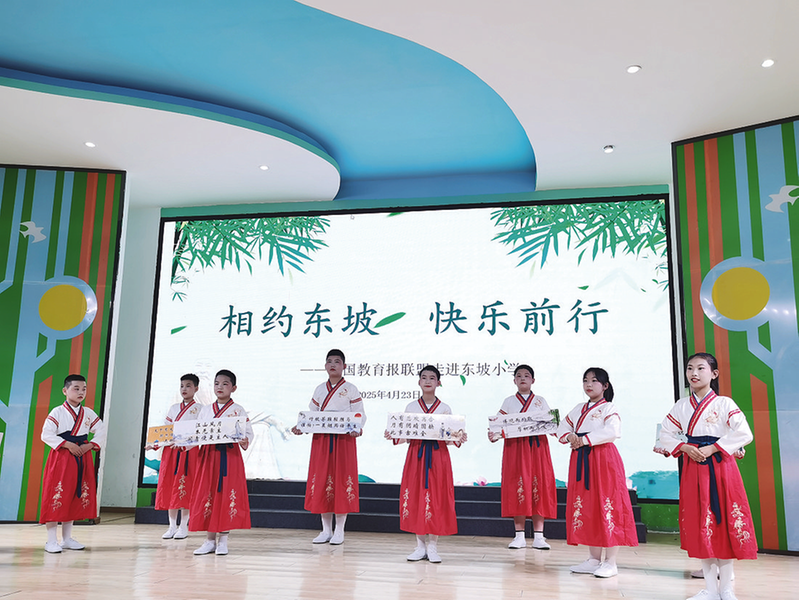 东坡小学通过“东坡那些事、东坡那些诗、东坡那些词”等系列主题,将东坡精神具象化。在文化长廊里,师生的书画作品和东坡诗词粉笔字作品整齐摆放;在剪纸工作坊中,通过天马行空的想象,学生们用“东坡绿”的纸展现东坡诗词里的生动画面;在东坡讲堂上,学生们用朗诵、舞蹈等表达着自己对苏东坡的热爱。东坡小学副校长李爱刚还为苏东坡的诗词谱曲,创作了《东坡》等十多首作品。“我在学唱的过程中感受到苏东坡积极乐观的心态,还有他对事物独特的观察和思考,我更喜欢他了。”四年级学生冷佳恒说。