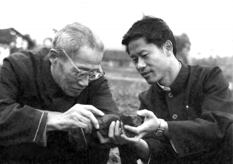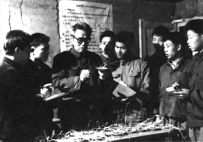二十世纪七十年代,侯光炯(左)在简阳县指导青年教师观察土壤结构